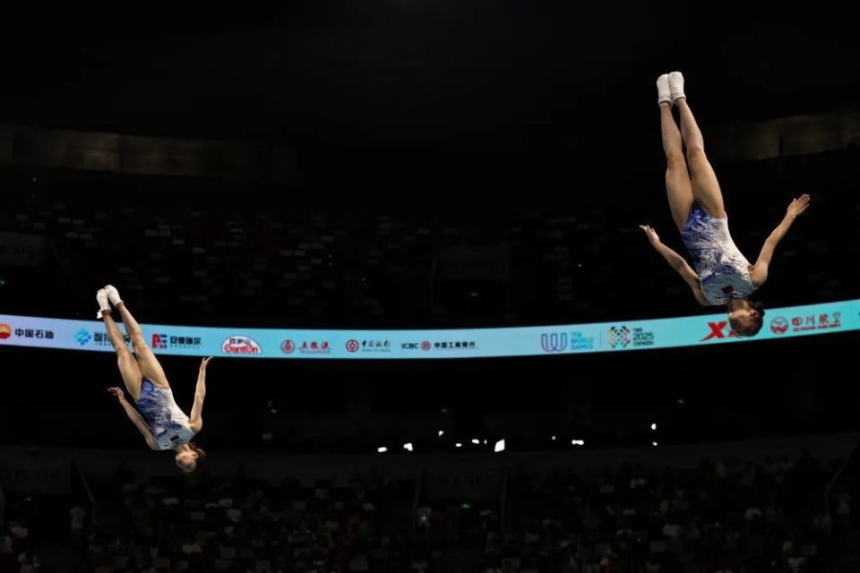 8月10日,第12届世界运动会蹦床项目的比赛在成都东安湖体育公园多功能体育馆收官,中国选手、山西运动员胡译乘和张欣欣斩获女子双人同步金牌,为中国代表团夺得本届赛事第十一枚金牌。